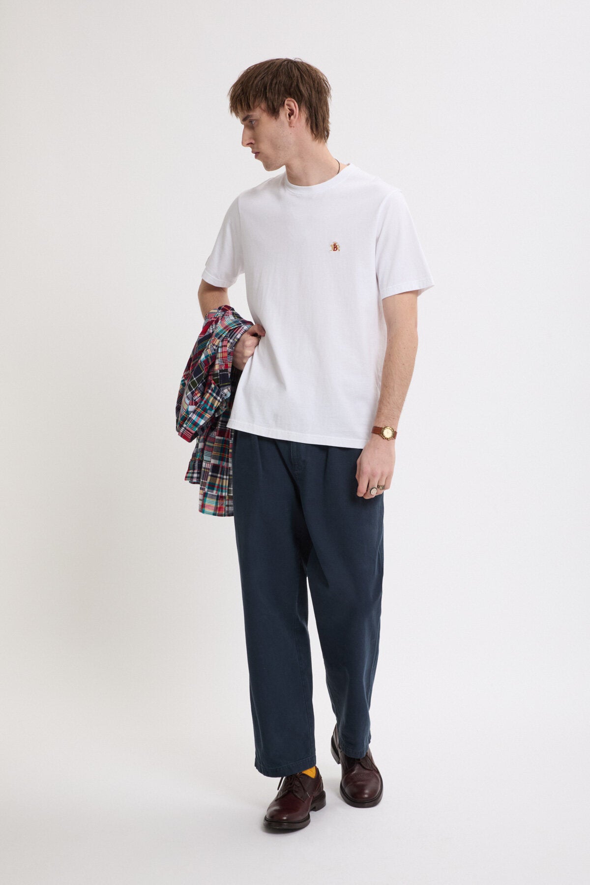 Zu jeder G9 gehört ein T‑Shirt. Dieses Crewneck‑Tee mit Rundhalsausschnitt aus 100% Baumwolle ist weich, atmungsaktiv und auf Langlebigkeit ausgelegt. Das auf der Brust gestickte Baracuta‑Logo setzt einen dezenten, charakteristischen Akzent – perfekt für den täglichen Gebrauch.