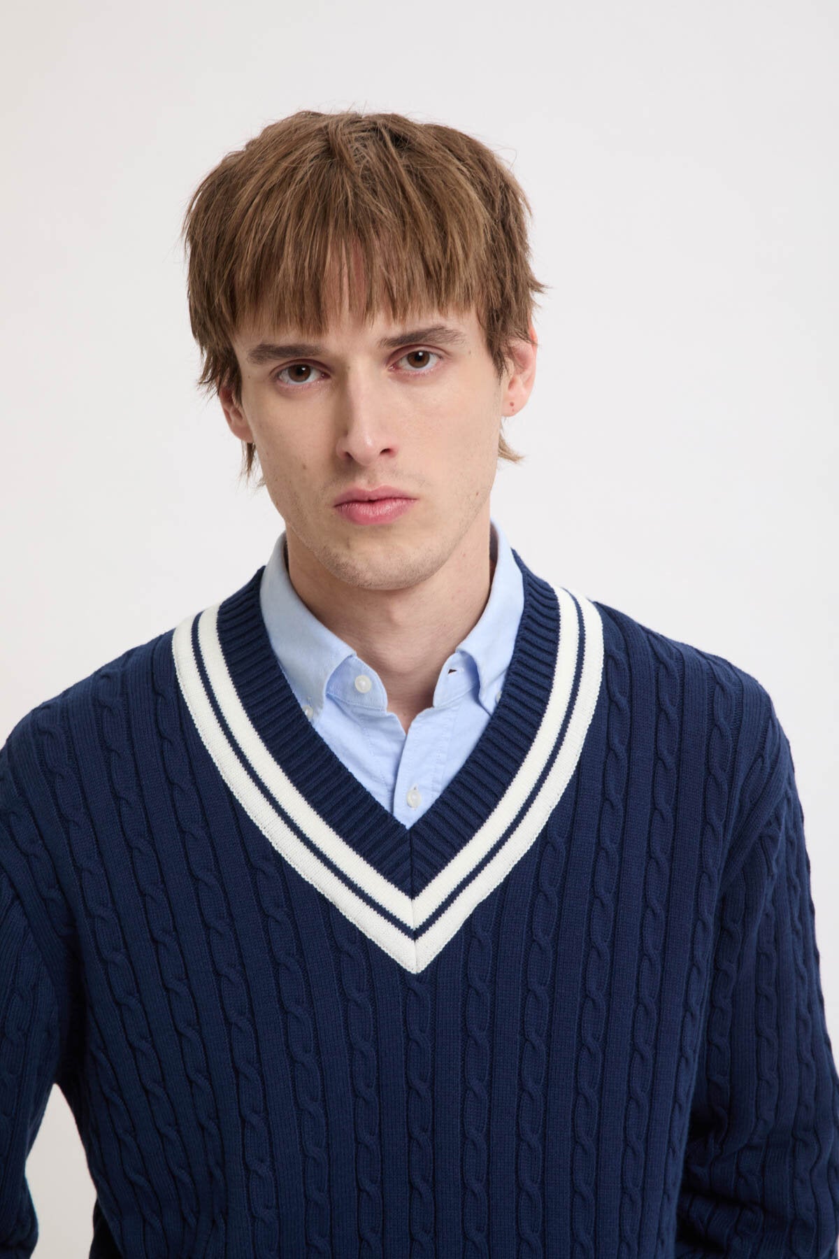 The Cricket V-Neck is made from 100% cotton cable knit, soft yet sturdy for everyday wear.