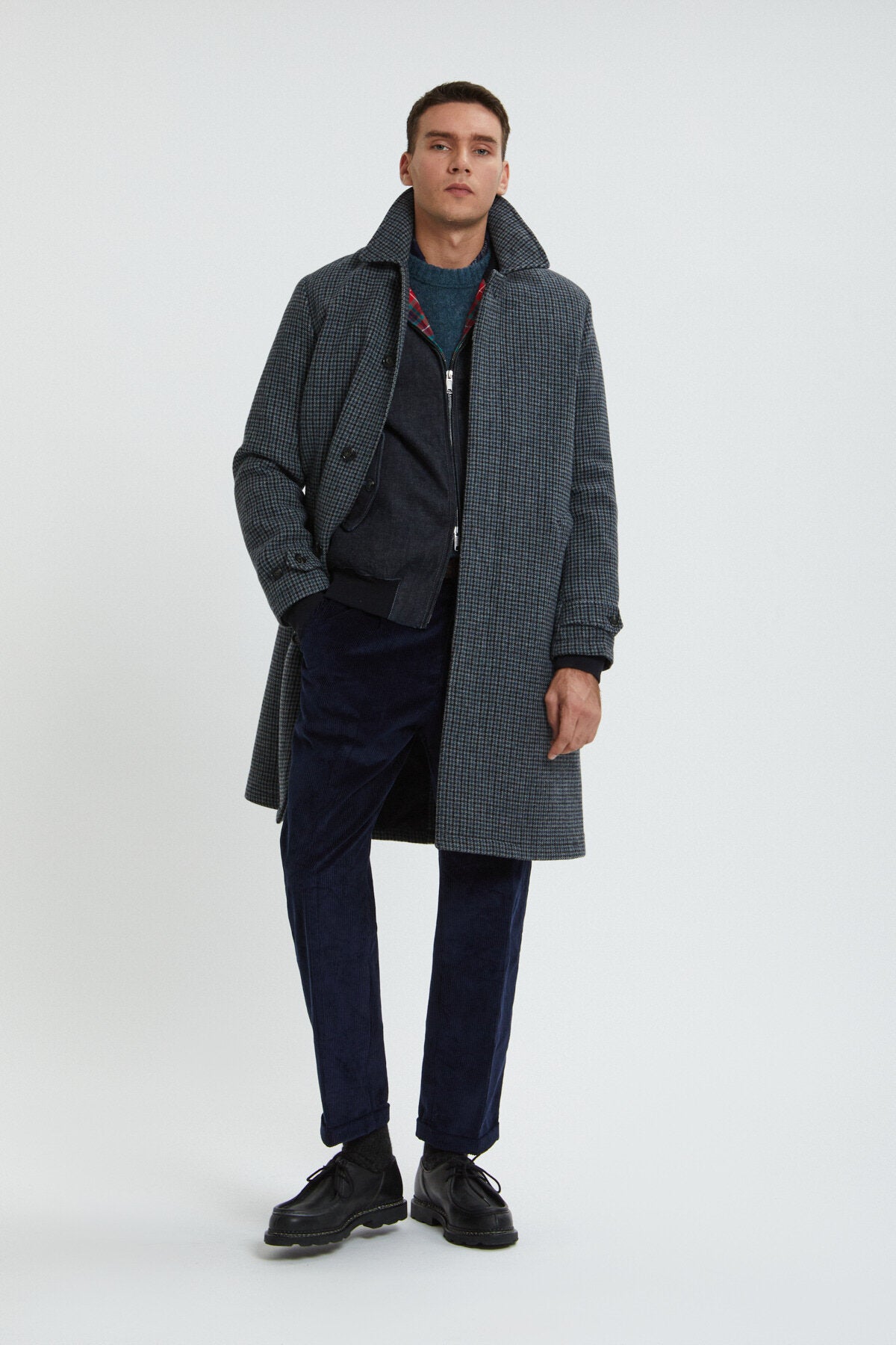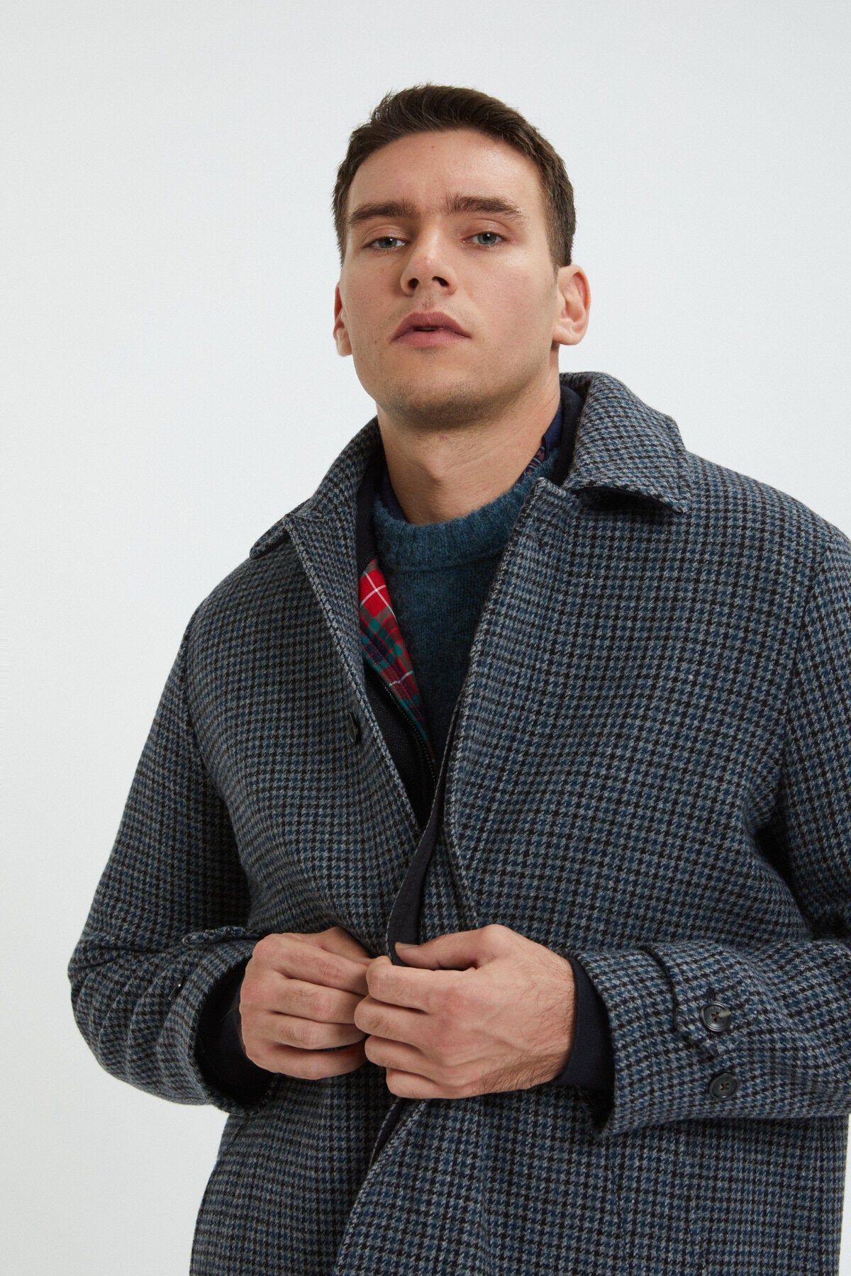 The Paul Coat, meticulously crafted from luxurious Abraham Moon English wool, epitomizes timeless style. Its classic design, featuring a distinctive herringbone pattern, exudes sophistication. This winter essential offers both warmth and comfort, thanks to its thick fabric lining with Fraser Tartan accents. Practical elements include slanted front pockets, an umbrella back yoke, adjustable cuffs, and a central hidden button closure. With a slightly under-the-knee length, it's the perfect blend of contemporary and classic.