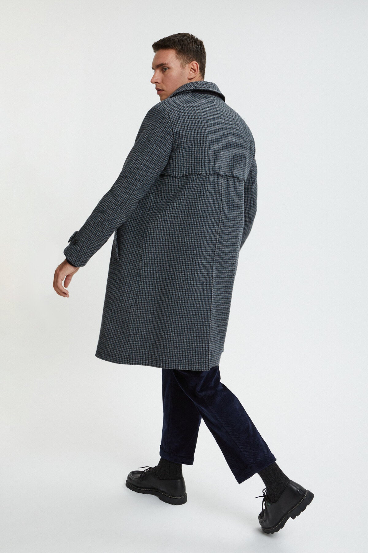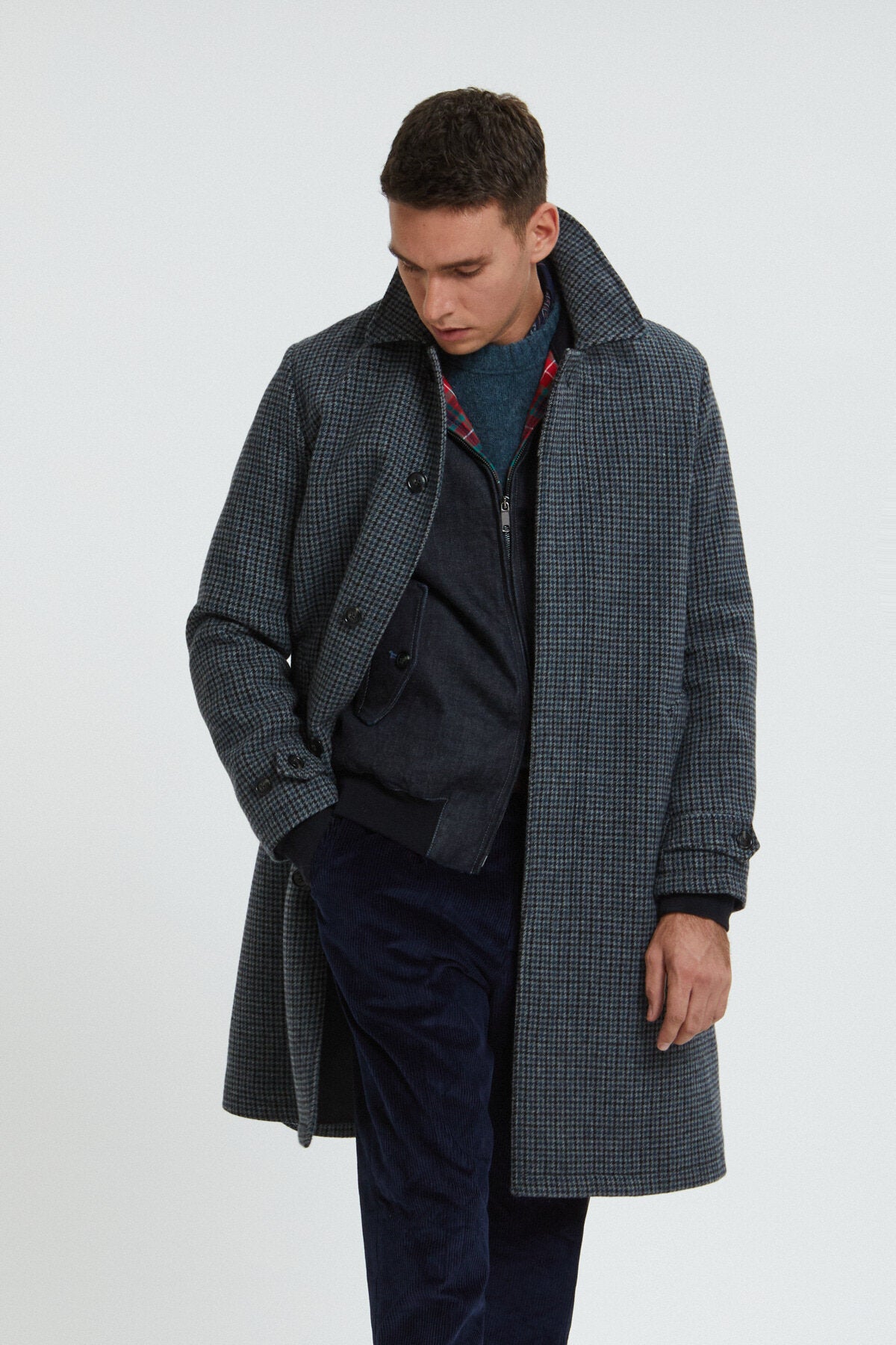 • • Central hidden button closure along the coat with single button closure at the collar.
