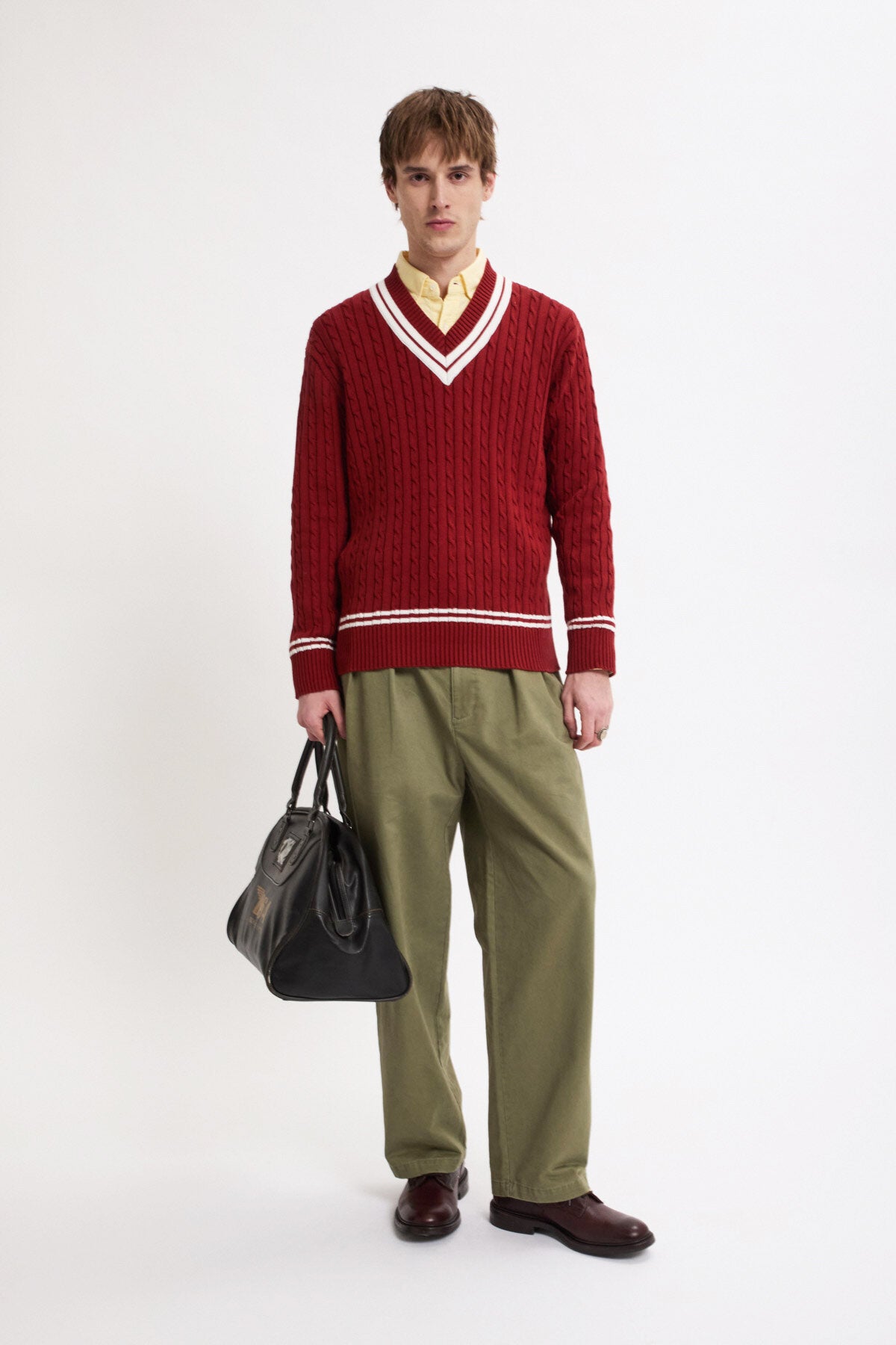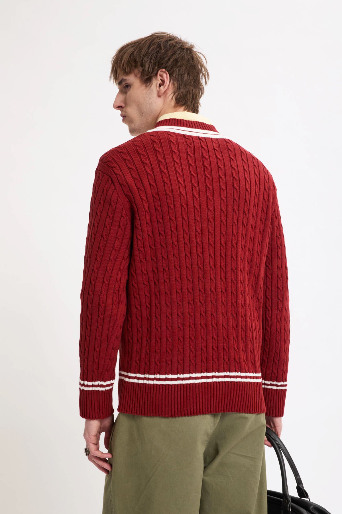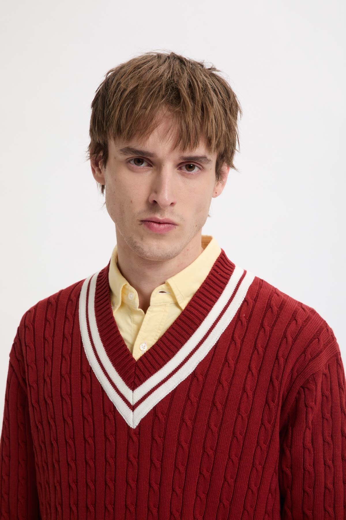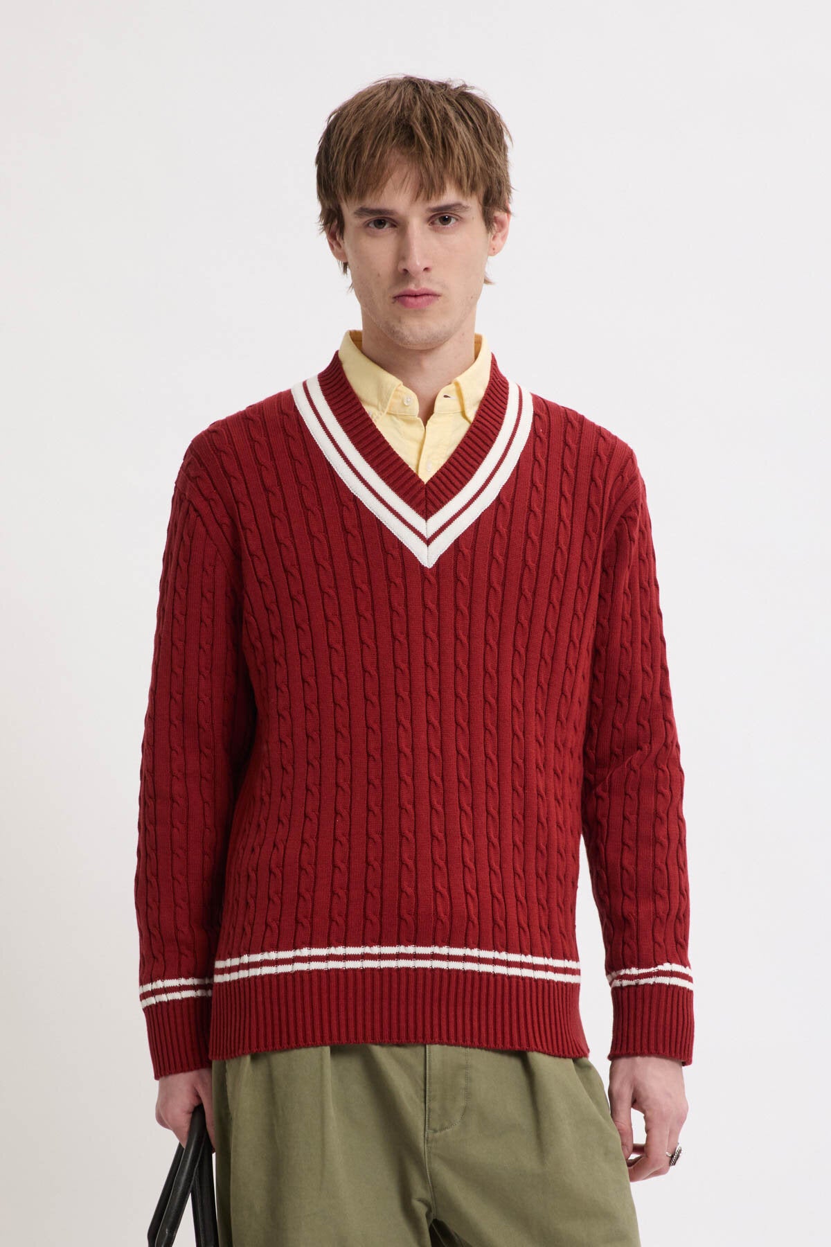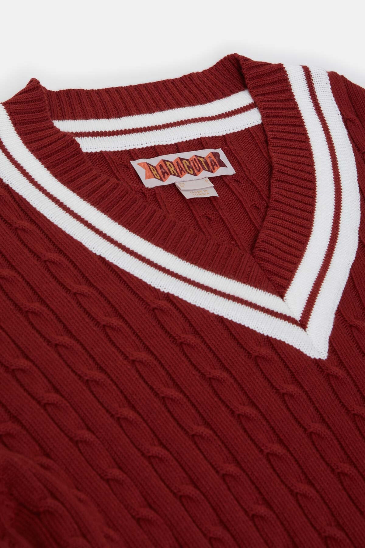 Le modèle Cricket col V est fabriqué en maille torsadée 100 % coton, à la fois douce et robuste pour un usage quotidien.