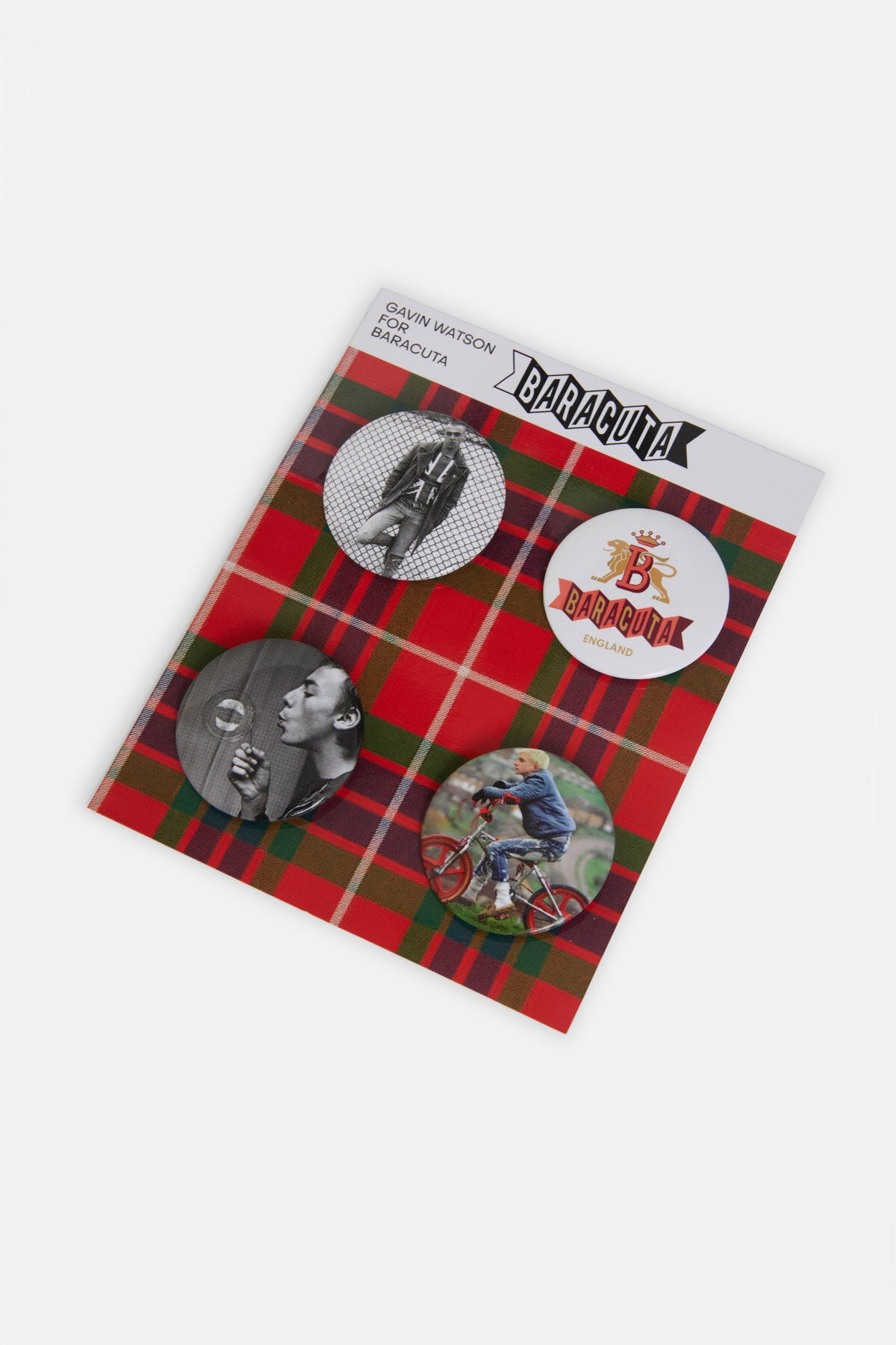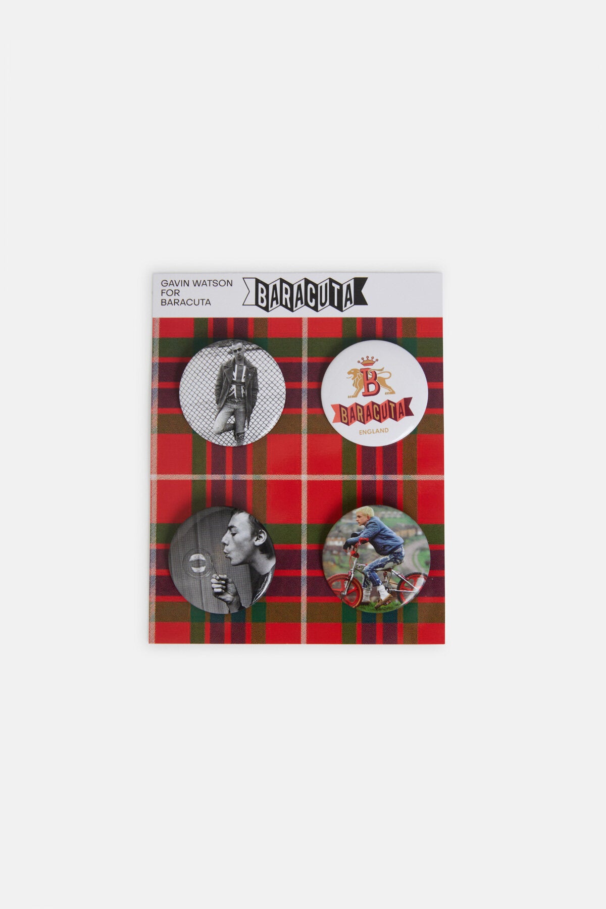 Cet ensemble de quatre broches présente trois des photographies les plus reconnaissables de Gavin Watson, tandis que le quatrième badge porte le logo Baracuta. Ensemble, ils forment une collection réfléchie qui célèbre l'héritage visuel de Watson et l'identité durable de Baracuta.